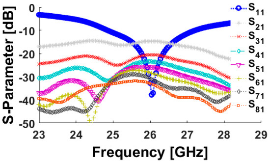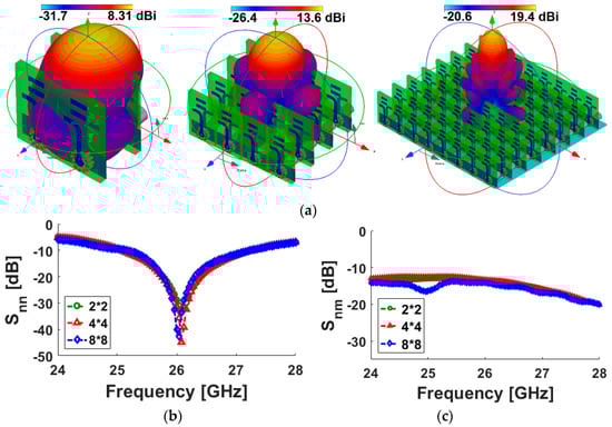 In addition, the characteristics of the 26 GHz planar Quasi-Yagi antenna array with different numbers of the radiators (2 × 2, 4 × 4, and 8 × 8) are studied in Figure 20. As shown in Figure 20a, the designed planar arrays exhibit directional radiation beams with high gain levels. Figure 20b,c illustrates the reflection coefficient and mutual coupling (Snn and Snm) characteristics of the middle elements for the planar arrays. As shown, similar performances of the S parameters with high isolation and low mutual coupling have been obtained for them. Reflection coefficients (Snn) of −35, −48, and −43 dB have been achieved for 2 × 2, 4 × 4, and 8 × 8 planar arrays. Furthermore, the designed Quasi-Yagi antenna arrays provide a low mutual coupling characteristic (less than −13 dB at 26 GHz).
