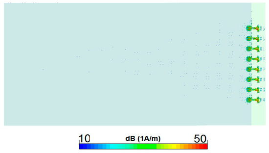 The simulated surface current densities at 26 GHz for the phased array 5G smartphone antenna has been illustrated in Figure 13. It can be seen that the current flows are distributed around the radiation arms of the Quasi-Yagi antenna elements on the top side of the smartphone PCB. Each single-element Quasi-Yagi radiator has a high current density and appears very active at the resonance frequency (26 GHz) [27].