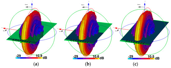 Radiation beams of the 5G smartphone antenna at 0°, (a) without GND, (b) half, and (c) full GND.