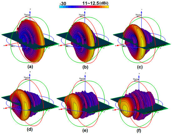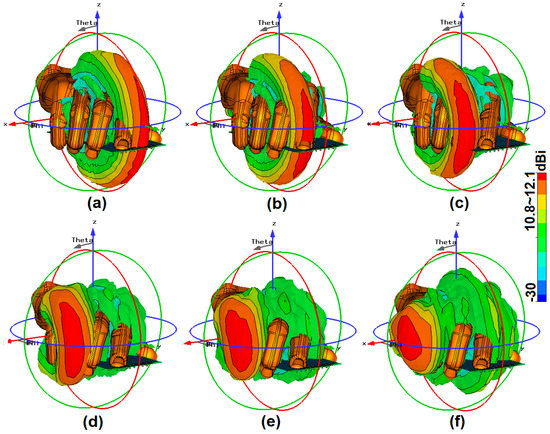 3D radiation beams of the 5G smartphone design at (a) 0°, (b) 15°, (c) 30°, (d) 45°, (e) 60°, and (f) 75°.