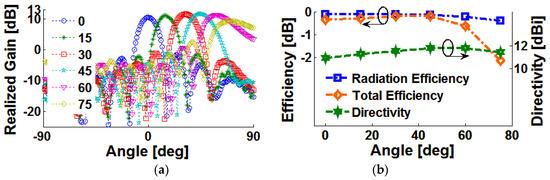 3D radiation beams of the 5G smartphone antenna are displayed in Figure 15. The direction and scanning angle of the phased array radiation beams can be assessed by applying the relative amplitudes and phases to the radiators. It can be seen that the presented 5G smartphone antenna has well-defined directional beams with wide-scanning property and high directivity values. In addition, the values of the antenna realized gains at different angles, which are specified in Figure 16a. As shown, the 5G smartphone antenna design exhibits sufficient realized gain levels (more than 10 dB) in the scanning range of 0° to 75°, which makes it suitable for future cellular applications. The 5G smartphone antenna also provides good efficiencies at different scanning beams. As can be observed from Figure 16b, more than −0.5 dB (90%) efficiencies have been obtained in the scanning range of 0–60 degrees. Furthermore, a high directivity characteristic (11–12.5 dBi) has been achieved for the presented design.