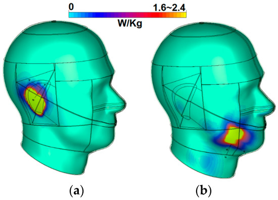The SAR function of the proposed phased array smartphone antenna is studied in Figure 18. SAR, one of the most critical issues of mobile terminal systems, is a measurement function for absorbed electromagnetic waves by the human body, which should be as low as possible [31,32]. The distance between the 5G smartphone antenna and the user’s hand in the z-axis is less than 15 mm. As illustrated in Figure 18, the antenna has sufficient SAR values for different placements. There is a bit of a difference in the SAR values for top and bottom placements of the 5G antenna, which was predictable due to different distances.