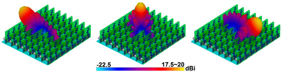 The designed 26 GHz Quasi-Yagi antenna can also be used in a planar array form for 5G base station or channel measurement applications [33,34]. Figure 19 illustrates the structures and the directional radiation beams of the designed planar phased array.