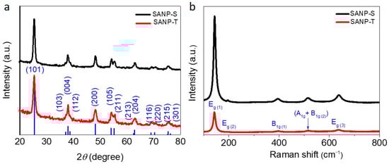 (a) X-ray diffraction patterns of powder collected from scratched SANP-S and SANP-T films; (b) Raman spectra of SANP-S and SANP-T films.