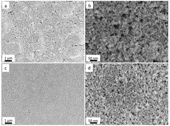The low- and high-magnification scanning electron microscope (SEM) images (Figure 2a–d) show the morphologies of SANP-S and SANP-T films. It can be observed that SANP-S (Figure 2a,b) had a more aggregated structure and non-uniform surface topography compared to SANP-T (Figure 2c,d), in line with our expectations. SANP-S films also showed significant cracking at this scale, which is attributed to aggregation. Both had similar particle size about 25 ± 3 nm, in line with the above XRD results.