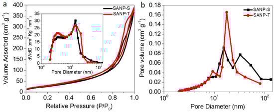 Figure 3a,b show the specific surface area and the pore size distributions in the two structures. The type (IV) nitrogen adsorption/desorption isotherm branches indicate that both materials have mesoporous structure [,] with similar porosities of ~64% (Figure 3a). [] On the other hand, SANP-T has a more uniform pore size distribution, with a broader range of pores in the 2–30 nm range. SANP-S also revealed some larger pores, as shown in Figure 3b, which were attributed to the cracked structure seen in SEM images above and in (Figure S1, Supplementary Materials). The SANP-S also has a slightly lower surface area (113 m2·g−1) compared to SANP-T (119 m2·g−1), which could be attributed to aggregation, and is in line with our previous experimental results for similar systems [].