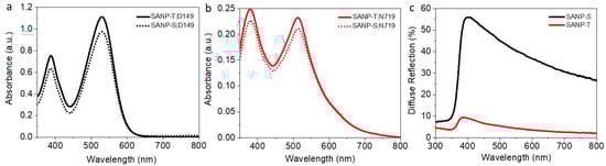 (a) and (b) Absorbance spectra of dye (D149 or N719) desorbed from either SANP-S or SANP-T films (5.0 ± 0.3 µm thick, area = 1 cm2); (c) Diffuse reflections of SANP-S and SANP-T films (10.0 ± 0.5 µm thick).