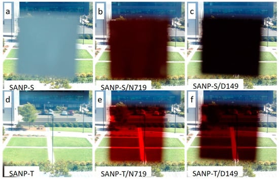 Visual images taken through 10 μm-thick photoanode films of (a–c) SANP-S and (d–f) SANP-T, with (a,d) no sensitiser or (b,e) sensitised with N719 or (c,f) D149.