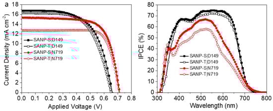 (a) Current–voltage (J–V) characteristics of SANP-S- and SANP-- based devices using D149 or N719, measured under 1 sun illumination with an active area of 0.16 cm2; (b) incident photon to charge carrier efficiency (IPCE) of the devices in (a).