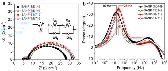 Electrochemical impedance spectroscopy (EIS) measurements. (a) Nyquist and (b) Bode plots of devices based on SANP-S and SANP-T sensitised with either D149 or N719.