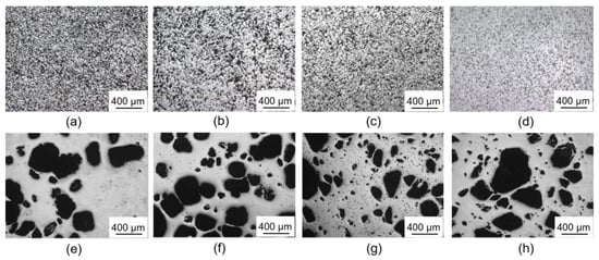 Micrographs corresponding to different processing conditions of evaluated techniques: Loose Sintering, conventional Powder Metallurgy (PM) and space-holder technique: (a) 0 MPa and 1000 °C; (b) 0 MPa and 1200 °C; (c) 13 MPa and 1000 °C; (d) 13 MPa and 1200 °C; (e) 30 vol.% NaCl; (f) 40 vol.% NaCl (g) 30 vol.% NH4HCO3; and (h) 40 vol.% NH4HCO3. All of the samples have been sintered for 2 h under high vacuum (~10−5 bar).