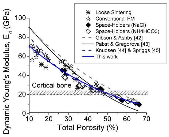 In addition, the influence of the total porosity in the Young modulus (by ultrasound technique) is illustrated in Figure 2. As expected, the material stiffness presents a direct relation to the effective area of the titanium matrix (inverse to the porosity). Mathematical models are also added to fit the experimental results: Gibson and Ashby [], Pabst-Gregorová [], and Knudsen [] and Spriggs [].