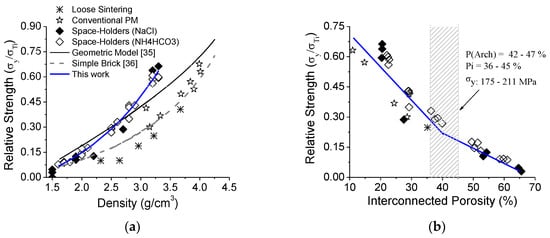 Moreover, in previous research, different models have been developed to explain the correlation between the relative strength and the density in sintered materials. In the geometric model, spherical pores are assumed []. It is based on the geometrical relation between the porosity and the cross section area of the material. In addition, there is a model known as “simple Brick” where the pores with a cubic geometry are supposed []. The relative strength is determined in this method, considering the probability of being found a solid part in the tested volume. A correlation between the relative strength vs. density and interconnected porosity of the porous titanium specimens, produced via conventional PM and space-holder techniques, are shown in Figure 3a,b, respectively.