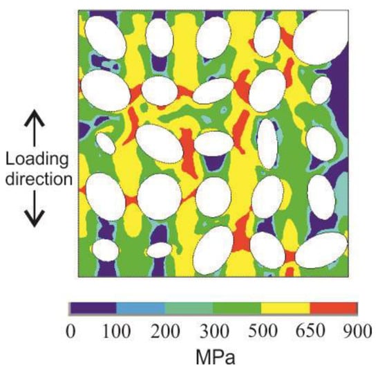 In Figure 4, it can be observed that, even though the applied macroscopic stress is only 170 MPa, there is a considerable portion of the material with a high stress level, due to stress concentration around the pores, as it could be expected.