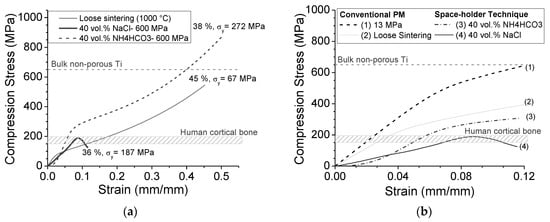 Uniaxial compression tests: (a) Young’s modulus closed to the cortical bone is set in ~29 GPa (porosity total range between 37.6–44.8%); (b) yield strength values are fixed in a range (150–200 MPa) meeting the requirements of the cortical tissue. Compression stress vs. Strain curves of specimens manufactured by different PM routes.