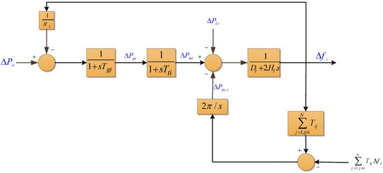 The system frequency response (SFR) model has been commonly used to represent the frequency dynamics of a power system [,]. The model can make use of re-heated turbines or non-reheated turbines. An SFR model block diagram of a non-reheated power system is shown in Figure 1. Generally, the model is commonly used in load frequency control (LFC) [,]. The dynamics of area i considering a multi-area power system is described by the differential Equations (4)–(8). This model can be used for practical power systems modelling and still giving technically sound results.