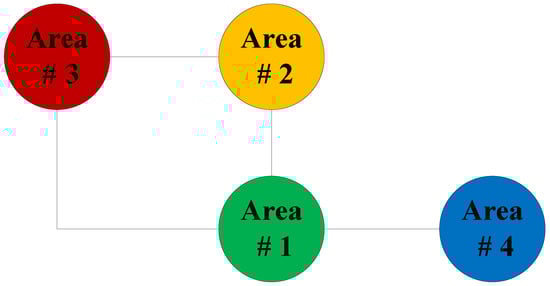 In real power systems, areas are interlinked to form one overall power system. An area can represent a single power plant with a number of generators. These several power plants are then joined to form a multi-area power system. In some cases, an area can represent a country and a number of countries can be joined to form a multi-area power system. As an example, to analyze the advantages of the proposed method, a four-area power system with non-reheated turbines is used in our simulations. The power system has been used in some research papers dealing with load frequency control [,]. In our case, we are applying it to estimate a disturbance in the event of a generation loss. As seen in Figure 4 Areas 1, 2 and 3 are interconnected with each other, while Area 4 is only connected with Area 1. Areas 1, 2, 3 and 4 are identical systems with non-reheated turbines. Figure 3 shows the general structure of each area. The data for the power system is given in Table 1.