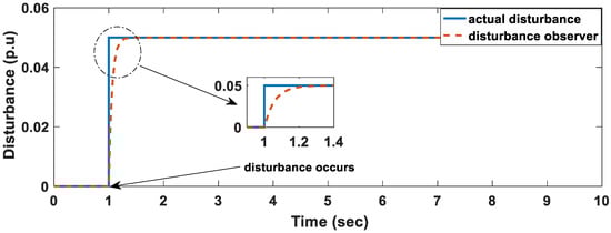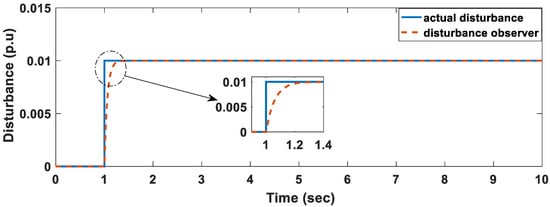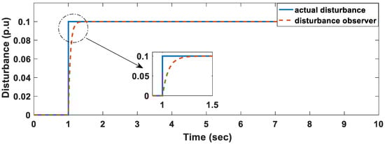 The use of disturbance observers is a technique that can be used to accurately determine the magnitude of the disturbance. In this sub-section, a four-area power system with non-reheated turbines is considered. Firstly, we consider the dynamics of the single area 2. Equation (31) is used to design the disturbance observer. The system matrix A is simply a 3 × 3 matrix and neglects tie-line dynamics. Afterwards we consider the dynamics of the whole area, a 16 × 16-system matrix A is used, and it makes use of four states per area that includes the tie line dynamics.