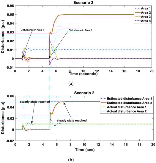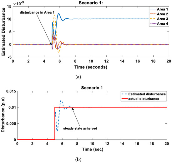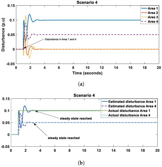 Finally, in scenario 4 a large and medium disturbances occurred in area 1 and area 4 respectively, both at . From Figure 11a,b, it took only 1.5 s in both cases to estimate the disturbance. It is also important to note that due to power line deviations in cases of two disturbance occurring at different times, the observed disturbance for the first occurred disturbance will drop then quickly return to its actual value.