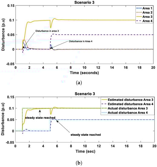 In scenario 3 a large disturbance occurred at in area 3 and a medium disturbance occurred in area 4 at . Figure 10a,b show that it took 3 s to estimate the disturbance in area 3 and less than a 1 s to estimate the disturbance in area 4. The power system under investigation is an interconnected power system consisting of several control-areas. In the aforementioned figure, a 0.1 p.u. disturbance occurred in area 3 at time s , then at time s another disturbance with magnitude of 0.05 p.u. occurred in area 4. Due to the natural interconnection between these areas by the major tie-lines, a dipping in the estimated disturbance in area 3 at s has occurred. This dipping would not affect the estimation and does not have bad consequences since the operator at the control center can monitor this situation and can observe the disturbances in all areas simultaneously.
