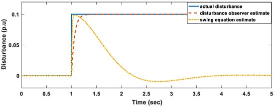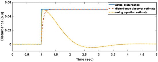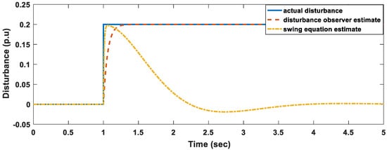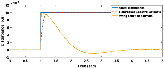 Based on WAMS, decentralized monitoring of the power system can also be done. Here we assume that each of the four areas is under the monitoring of an operator specifically responsible for that area. We only considered the results for area 2 because we assumed that in the other three areas no disturbance occurred. In all the simulated scenarios, a disturbance occurred at , as shown in Figure 5, Figure 6 and Figure 7. In all cases it took the disturbance observer only 0.2 s to estimate the disturbance. The estimated values were the same as the actual disturbance that occurred. This shows the superiority of disturbance observers if the system parameters are known.