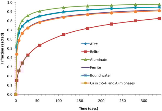 19] proposed an empirical formula (Equation (5)) to express the rates of reaction of alite, belite, aluminate, and ferrite. In this function, F is the fraction of the major clinker phases reacted at time T, in days, and k