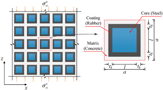 Figure 1 shows the cross section of a 2D periodic foundation with vertical loads. The foundation was made of periodic arrays of square steel cylinders coated with rubber in a concrete matrix, where the length of the cylinders in the y-direction was assumed to be infinite. Hence, wave propagation in the periodic foundation could be reduced to a 2D problem. A typical unit cell can be defined, as shown in Figure 1, where the side length of square cylinder is l, the thickness of coating layer is tk, and the periodic constant is a. According to the periodic structure theory [18], wave propagation in periodic structures can be investigated by the dynamic analyses of a typical unit cell. In the present paper, the materials of the cores, the coating layers, and the matrix were assumed to be linearly elastic and isotropic. Furthermore, for simplicity, the effect of vertical loads from the upper structure was reduced as homogeneous initial stress, σ z z 0 , in the 2D periodic foundation.