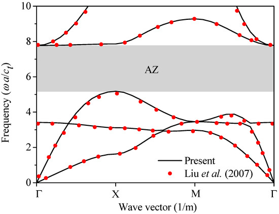 Using the finite difference method, Liu et al. [24] studied the AZs of a 2D Bragg scattering periodic structure that was made of periodic Pb inclusions in rubber matrix, which is a special case of the present work by taking the core and the coating layer as the Pb inclusion. The mass density and elastic coefficients C11 and C44 of Pb were 11,600 kg/m3, 72.1 GPa, and 14.9 GPa, respectively. The mass density and elastic coefficients C11 and C44 of rubber were 1300 kg/m3, 680k Pa, and 40k Pa, respectively. Figure 2 shows the dispersion curves calculated by the present method and the finite difference method, where the filling ratio of Pb in the typical unit cell was 0.36. In Figure 2, the horizontal ordinate represents wave vectors along the boundary of the first irreducible Brillouin zone, and the vertical ordinate represents wave frequencies. Each pair of wave vector and frequency corresponded to a wave propagation mode. For waves with frequencies in the shaded area in Figure 2, there were no corresponding wave propagation mode, which means that these waves were forbidden in the periodic structure. Thus, the frequency range of the shaded area was named as AZ. The solid lines and scatters in Figure 2 represent the results obtained by the present method and the finite difference method, respectively. It can be seen from Figure 2 that the AZs determined by the present method matched well with those by the finite difference method.