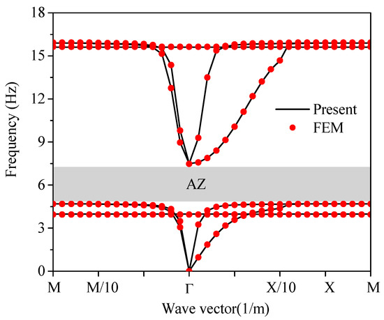 The finite element method (FEM) has been extensively used in the study of periodic structures [25,26,27]. In the present paper, the matrix, coating layers, and square cores were made of concrete, rubber, and steel, respectively, and whose material parameters are listed in Table 1. We set the geometric parameters mentioned in Section 2 as a = 2   m , t k = 0.2   m and l = 1   m . Figure 3 shows the dispersion curves of in-plane waves in the 2D locally-resonant periodic foundation, where the continuous lines represent results obtained by the present method and the solid circles represent results given by the FEM. It can be seen from Figure 3 that the AZ ranged from 4.69 to 7.49 Hz. Moreover, agreement in terms of the range of the AZ by the above two methods was good, which validates the present method again.