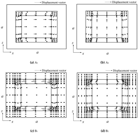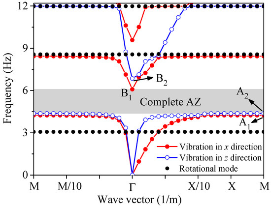 Figure 4 shows the dispersion curves in the 2D locally-resonant periodic foundation in Section 3.2, where the initial stress due to the vertical loads was taken as σ z z 0 = 40   kPa . Figure 5 shows the mode shape of frequencies A1, A2, B1, and B2. Combing Figure 3, Figure 4 and Figure 5, it can be found that the unit cell was symmetric in terms of both the geometric and mechanical aspects, without considering the effect of vertical load. Thus, the bound frequencies of the AZ, which were corresponding to the vibration modes of the steel core in the x- and z- directions, were identical. However, after including the effect of vertical loads, the bound frequency corresponding to the vibration modes of the steel core in the x-direction decreased more than that in the z-direction, which led to the discrepancy between the AZ bounded by A1 and B1 and that by A2 and B2, as shown in Figure 4. For vibration modes of the steel core in the x-direction, there were two AZs below 10 Hz, which were 4.24~6.09 and 8.44~9.58 Hz, respectively. For vibration modes of the steel core in the z-direction, there was only one AZ below 10 Hz, which was 4.37~6.85 Hz. According to the definition of complete AZ, the complete AZ with σ z z 0 = 40   kPa was 4.37~6.09 Hz, which was lower and narrower than that without vertical load.