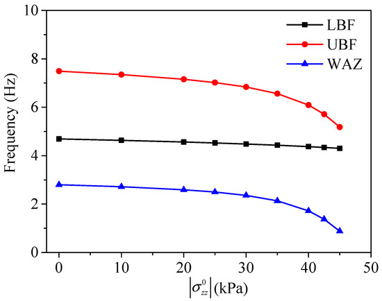 The width of the complete AZ was defined as WAZ   =   UBF LBF , where UBF and LBF are the upper- and lower-bound frequencies of the complete AZ, respectively. The influence of the initial stress on the complete AZ is shown in Figure 6. It could be found that both the LBF and UBF decrease as the compressive initial stress increases. Moreover, the decrease of the UBF was more than that of the LBF, resulting in the decrease of WAZ. The reason is that the stiffness of the unit cell to resist displacement in the x-direction was reduced more than that in the z-direction. It resulted in the UBF, corresponding to the vibration mode of the steel core in the x-direction, being more sensitive to the change of compressive initial stress.