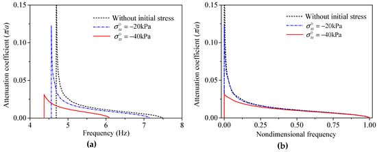 Figure 7. Attenuation coefficients versus (a) frequency and (b) non-dimensional frequency with different initial stresses.