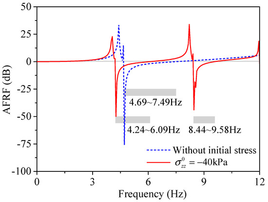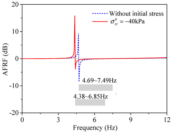 Figure 10 shows the AFRFs of the five-unit-cell periodic foundation under P waves, where the steel core moved in the z-direction. It can be seen from Figure 10 that the frequency ranges with significant attenuation were in accordance with the findings in Section 4.1, for both the case with initial stress and without initial stress, which again verifies the results for the 2D periodic foundation with infinite unit cells.