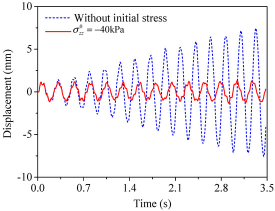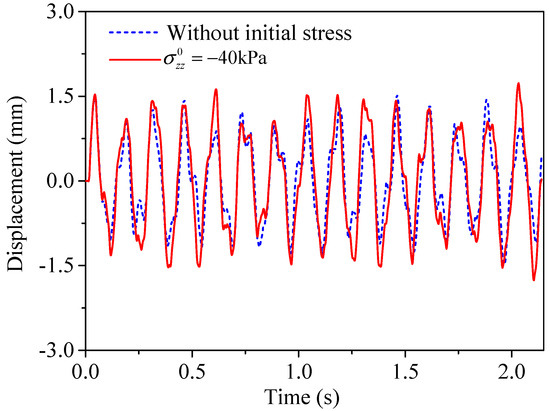 Figure 12 shows the averaged dynamic responses of the top edge of the periodic foundation under SV wave with f = 7   Hz . Note that the excitation frequency f = 7   Hz was inside the AZ without initial stress but outside the AZs with initial stress σ z z 0 = 40   kPa . According to the results in Figure 7a, the attenuation coefficient at f = 7   Hz was quite small in the AZ without initial stress. It can be seen from Figure 12 that the averaged dynamic response of the top edge of the periodic foundation without initial stress was slightly smaller than that with initial stress σ z z 0 = 40   kPa , which supports both the theoretical analyses and the frequency-domain response analyses.