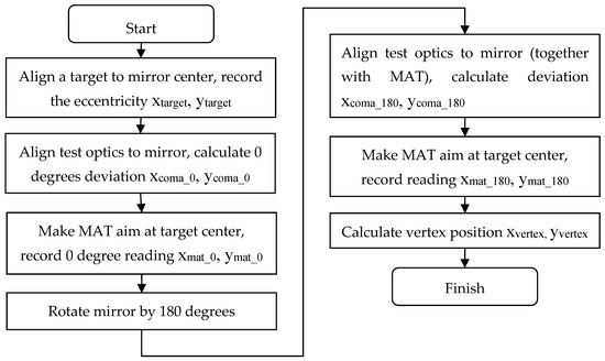 The MAT allows the user to set reference lines of sight for applications such as the alignment and measurement of bearings and bores. By use of two built in optical micrometers, two dimensional displacements can be measured with high accuracy from a reference line of sight. The MAT is moved together with the test optics so that it can maintain relative position and orientation with the virtual axis. If the vertex is not at mirror’s mechanical center, the MAT could observe target displacement after rotating the mirror and re-aligned to the test optics. Thus, the vertex position can be determined with two dimensional displacements from the MAT.