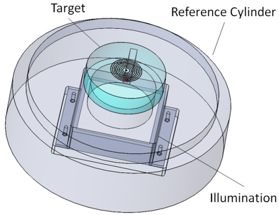 The optical target for MAT is mounted on a hollow reference cylinder (see Figure 2). An OGP SmartScope ZIP 250 vision measuring system (maximum permissible error (MPE): 1.8 + 6 L/1000 µm, where L is the measured length in mm) is used to measure the eccentricity between the target and reference cylinder. The vision measuring system measures the reference cylinder’s outer edge (roundness is 3 μm) and analyzes cylinder’s center position, then it aims at the central circular dot of the target with a crossline to determine the eccentricity. The eccentricity is measured and adjusted to 3 μm in x direction and −2 μm in y direction. A rectangular light emitting diode (LED) is fixed in the reference cylinder and it provides uniform illumination light which is suitable for observation.