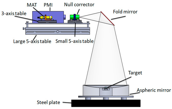 A Zygo GPI-XP/DPMI (test beam diameter: 4 inch) [7] is placed horizontally on the test tower with a 45° fold mirror which makes easy to align the optical path of heavy PMI system (see Figure 3). To align the optical path, a large 5-axis table which enables precision translation in the X, Y and Z axes, as well as tip-tilt adjustment for the PMI measurement is used. The refractive null corrector is also placed on the large 5-axis table and it is aligned to the PMI with a small 5-axis table by using interference fringe in the first place, then the large 5-axis table is precisely adjusted to align the optical path until the residual coma and defocus terms are within 0.2λ.