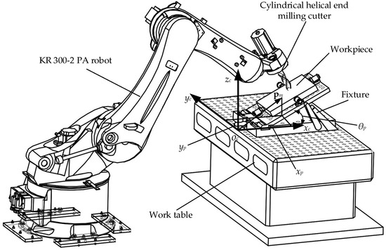 As shown in Figure 1, a robotic machining system for milling is being developed. The system is composed of a Kuka KR 300-2 PA robot, a cylindrical helical end milling cutter mounted the robot end-effector, a work table located within the robot workspace, a modular fixture placed on the work table, and a workpiece to be machined. Both the work table and the fixture have pin holes for positioning reference and bolt holes for fastening, and the workpiece is fixed on the fixture. In addition, the inclination angle θp between the fixture and the work table can be adjusted. As a result, the pose of the workpiece relative to the robot can be represented by the position of the fixture on the work table denoted by xp and yp and the inclination angle θp as displayed in Figure 1.