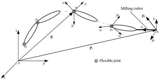 We first establish a structural dynamics model for the industrial robot to analyze the vibration characteristics. For this purpose, an n-DOF industrial robot with n links and n rotary joints is illustrated in Figure 2. A cutter tool is mounted on the robot end-effector. The local body-fixed coordinate systems {oi_xiyizi} (i = 1, 2,…,n) and the tool coordinate system {ot_xtytzt} are established at each joint and at the cutter tool tip, respectively. The position vector of the ith joint and the origin of tool coordinate system in the inertial coordinate system {o_xyz} are denoted by Pi and Pt respectively. During the milling operation, the cutter is subjected to an external machining force FE.