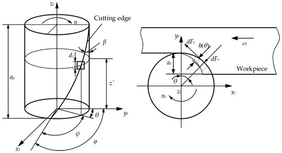Due to the existence of the helix angle of the cutter tool, the axial height of cutter teeth varies with the cutting thickness. Therefore, a microelement method is used to model a single cutter tooth. First, the cutter edge is discretized into numerous cutting-edge elements along the zt axis direction, and the height of each axial element is denoted as dz. φ represents the projection angle of the entire cutting edge in the xtotyt plane, and this projection angle is denoted as ψ when the axial height reaches z′. Then we have the following equations [42,43,44]: