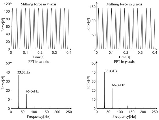 According to the milling parameters given in Section 4.1, we first obtain the milling force and its Fast Fourier Transform (FFT), as shown in Figure 6, when the speed n is equal to 1000 rpm. We can see that this spindle speed leads to a frequency of 33.33 Hz for the cutting force with two teeth.