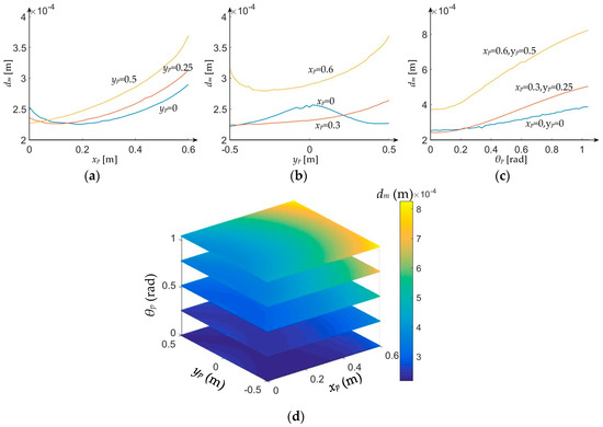 dm with the different workpiece poses p: (a) The curves of dm change with xp when θp = 0 and yp = 0 m, 0.25 m, and 0.5 m; (b) the curves of dm change with yp when θp = 0 and xp = 0 m, 0.3 m, and 0.6 m; and (c) the curves of dm change θp when [xp, yp] = [0,0] m, [0.3, 0.25] m, and [0.6, 0.5] m. (d) The variation of dm in the xpyp plane when θp is equal to 0, π/12 rad, π/6 rad, and π/3 rad.