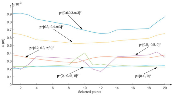 To capture the possible coupling between the three optimization variables, a global optimization algorithm is used for solving the problem. The algorithm utilized here, called optQuest/NLP or OQNLP [47], is designed to find the global optima for pure and mixed integer nonlinear problems with multiple constraints and variables, where all the objective functions are differentiable with respect to the continuous variables. The optimization results and the other selected five sets of dates are listed for comparison in Table 2. The curves in Figure 8 show the steady-state amplitudes of the tool offset in the selected positions along the milling path with different workpiece poses p. We can find that dm introduced in Section 3.3 is strongly influenced by the workpiece pose. In addition, when the workpiece pose remains unchanged, dm can vary greatly at different points along the milling path. The optimal workpiece pose is obtained as p = [0, −0.46, 0]T, which gives the smallest average tool offset amplitude dm of about 0.22 × 10−3 m. Also, the tool offset changes relatively smoothly in different positions along the path compared with the variations with other workpiece pose parameters. dmi represents the dm at the position of the ith workpiece position.