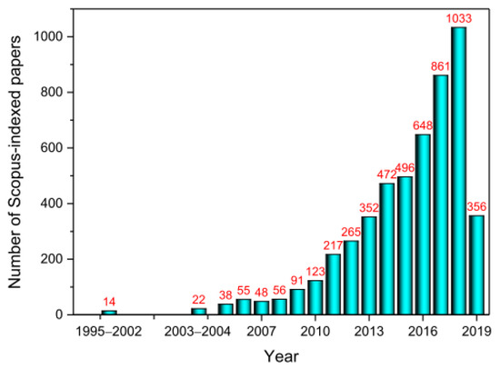 Time distribution of papers dealing with energy-related applications of electrospun nanomaterials (ENMs) published in Scopus-indexed scientific journals from 1995 to January 2019.