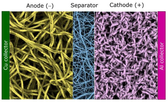 Electrospinning is a viable route to simultaneously implement all these ameliorative strategies. Therefore, it has been increasingly and extensively utilized for the production of all the battery components—not only anodes [12,56,57,58,72,74,81,82,84,85,86,87,88,89,90,91] and cathodes [12,92,93,94,95], but also electrolytes [12,96,97,98] and separators [12,99,100], which makes it feasible to manufacture secondary batteries by assembling components produced exclusively by electrospinning (Figure 5).