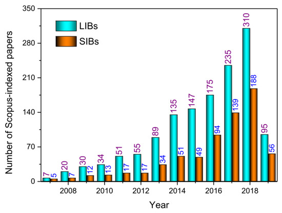 Time distribution of papers dealing with lithium- and sodium-ion batteries (LIBs and SIBs) based on ENMs published in Scopus-indexed scientific journals from 2007 to January 2019.