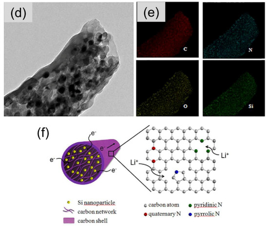 (a) Schematic illustration of the Si/C@CNF fabrication process. (b,c) SEM and (d) TEM images of Si/C@CNF and (e) elemental mapping of the fiber components. (f) Sketch of Li+ and e− conduction paths in the Si/C@CNF electrode (reproduced from reference [82] with permission. Copyright 2018, Elsevier).