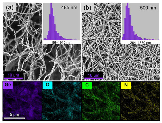 SEM images of self-standing paper-like electrospun fibrous membranes prepared (a) without and (b) with post-spinning cold pressing. An open and loose structure is obtained in the former case, whereas in the latter, the membrane has a more compact and tight structure and is rigid. Bottom: elemental mapping of the Ge, O, C and N fiber components (readapted from ref. [57] with permission. Copyright 2017, Elsevier).