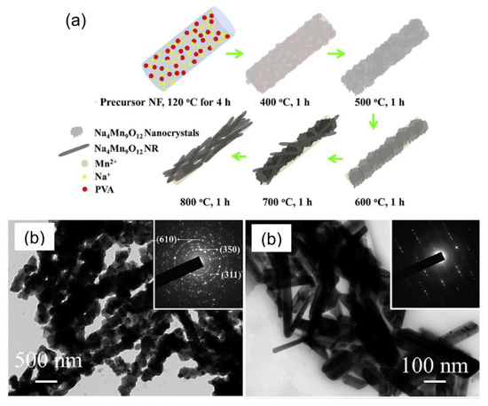 (a) Sketch of the shape evolution of the building blocks forming the electrospun Na0.44MnO2 fibers upon the increase of the heat treatment temperature. (b,c) TEM images (insets: related SAED patterns) of the fibers obtained at (b) 600 °C and (c) 800 °C (reproduced from reference [124] with permission. Copyright 2016, Elsevier).