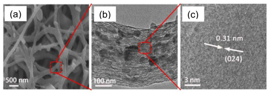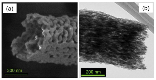 Anodes based on electrospun iron(III) oxide fibers doped with silicon exhibit better stability [140]. They are able to deliver 350 mAh/g after 70 cycles retaining 85% of the initial capacity—a result never achieved for iron oxide-based electrode standard formulation. The doping with an aliovalent element induces changes in the crystalline phase of the oxide and in its morphology, as well. The undoped fibers consist of interconnected polycrystalline hematite (α-Fe2O3) grains (Figure 12a), whereas the Si-doped fibers are constituted by elongated maghemite (γ-Fe2O3) nanostructures developing mainly along the longitudinal fiber axis (Figure 12b).